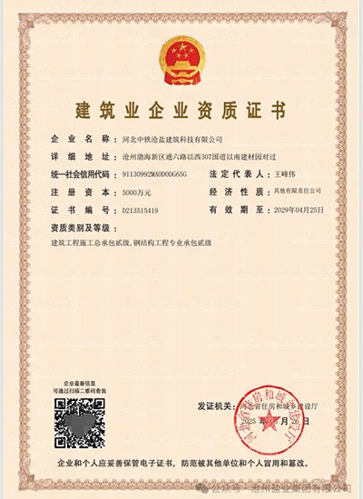 5月26日,河北中鐵滄鹽建筑科技有限公司成功實(shí)現(xiàn)了資質(zhì)證書(shū)的升級(jí),資質(zhì)類(lèi)別及等級(jí)正式提升為建筑工程施工總承包貳級(jí)、鋼結(jié)構(gòu)工程專(zhuān)業(yè)承包貳級(jí)。